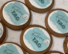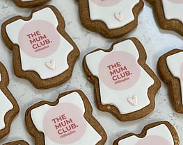 Some examples below of corporate logo biscuits and personalised baby boxes.